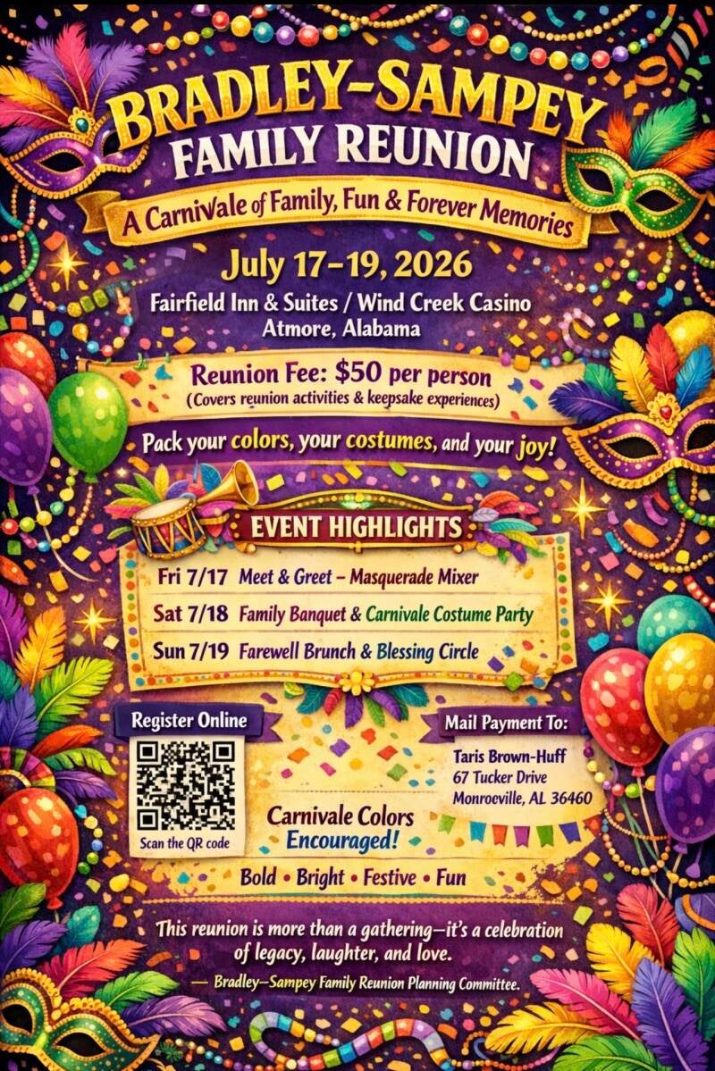 We are committed and dedicated to creating an unforgettable experience for our familly. Join us for the Reunion as we celebrate the Bradley-Sampey history and heritage!